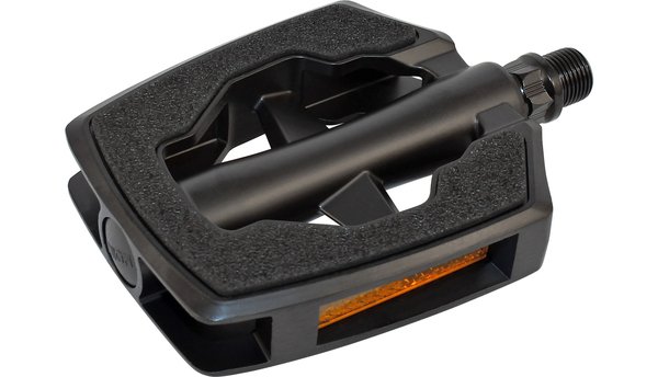 Plastic platform pedals with a large platform covered in rubber. For everyday use on a city bike, hy..