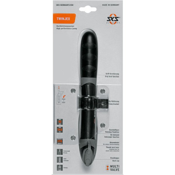 The SKS TWINJEX mini pump with universal MULTI VALVE valve connection is the ideal companion for cycling trips thanks to its large volume. This bike pump is not only appreciated for its optimum ergonomics and rubberised grip parts. Thanks to the rubberised grip points, it lies comfortably in the hand Thanks to the pump's high-pressure stage, it's easy to inflate the tyres up to 10 bar. The compression lever ensures a secure hold on the valve. - Handle ergonomically - Connectable high pressure stage - MULTI VALVE valve connection - Compression lever - Pump holder available - Made in Germany